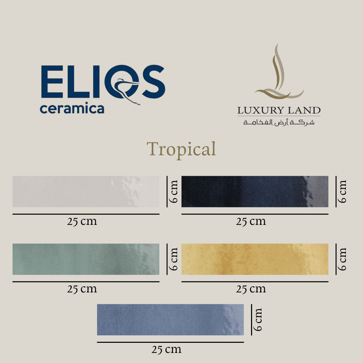 اكتشف جمال البلاط الإيطالي الفاخر من Elios الذي يجمع بين الأناقة الأوروبية والجودة العالمية. بلاط تروبيكال بمقاس 6×25 سم يمنح مساحاتك طابعاً عصرياً مميزاً يعكس ذوقك الرفيع.